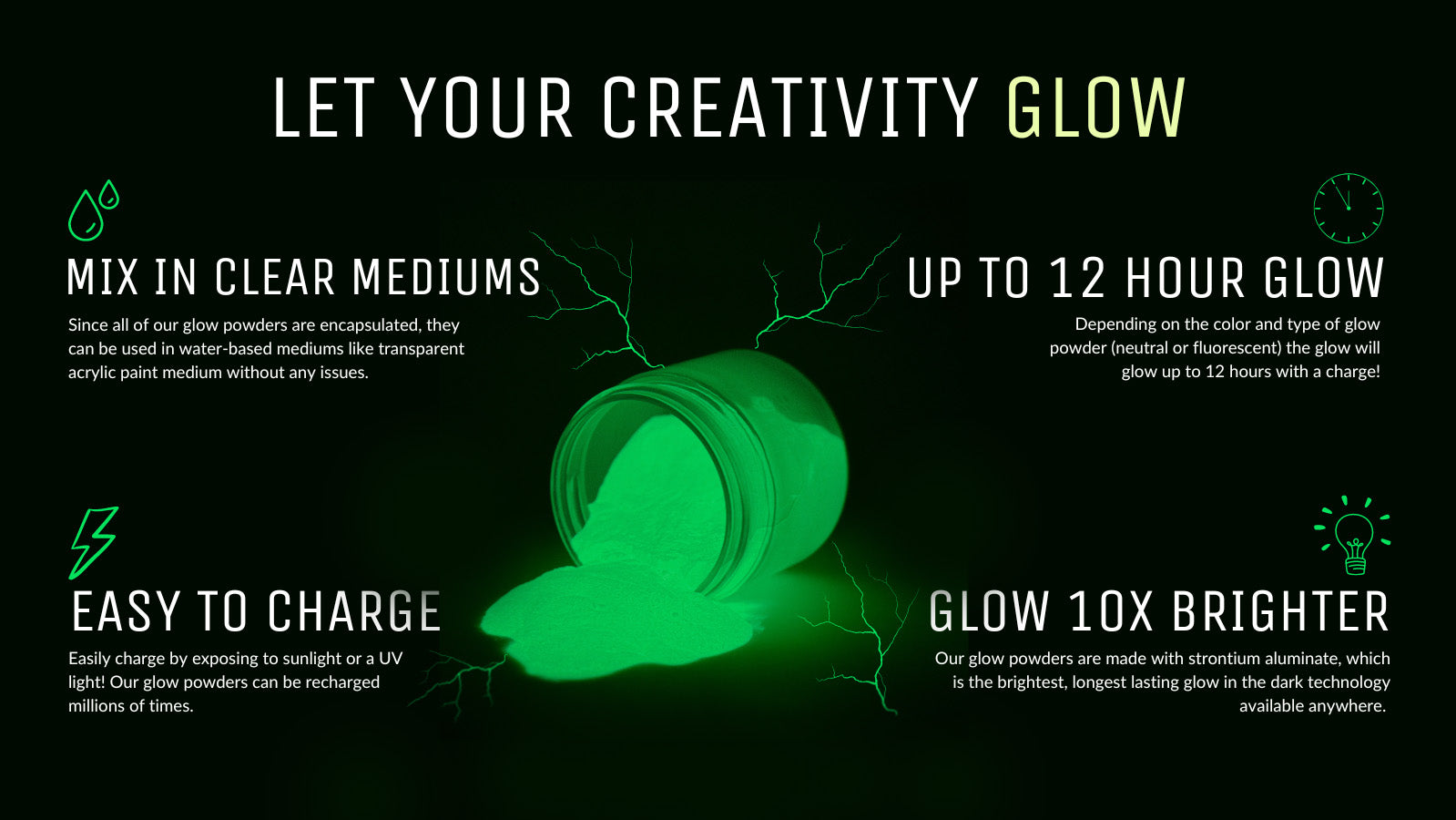 Due to their unique crystalline structures, each glow in the dark color has a different maximum brightness and glow time. Neutral Dark Blue glow powder is one of the more difficult colors to charge. Many times people think the powder is defective, but in reality, they are just not using the appropriate light source to charge it. Once they use the correct light source they see that it does in fact glow vibrantly.